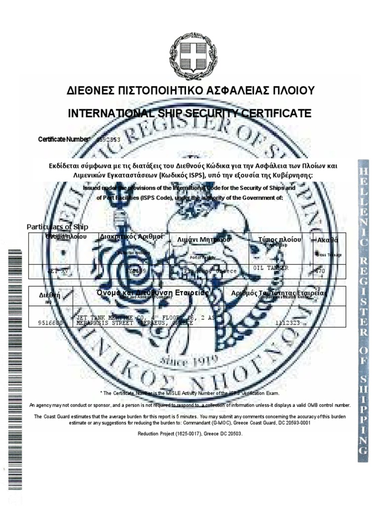 International Ship Security Certificate Διεθνεσ Πιστοποιητικο Ασφαλειασ