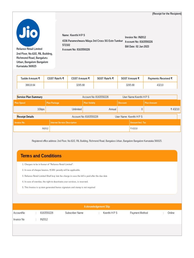 Jio Bill PDF Receipt Invoice