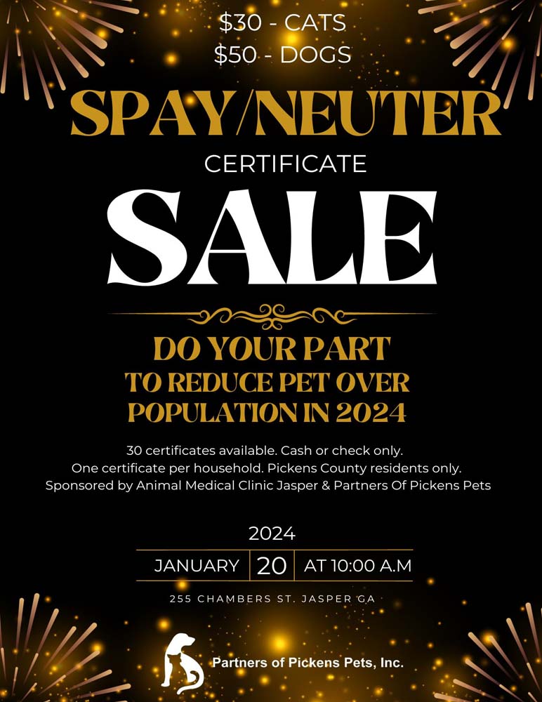 Spay/Neuter Certificate Sale on January 20 2024 10:00 AM