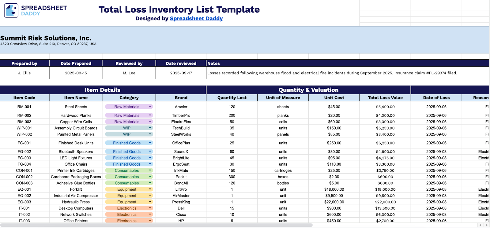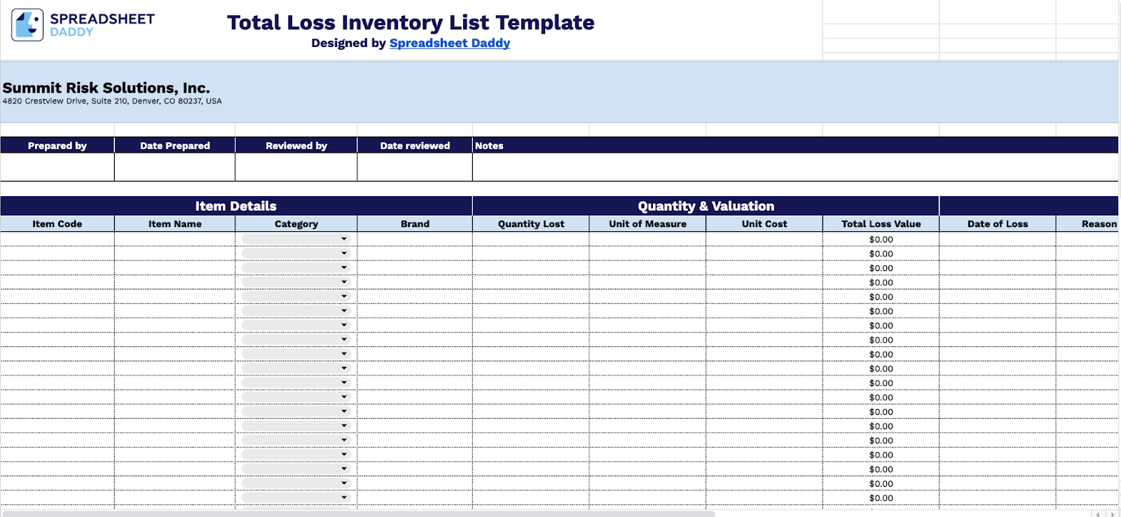 Free☝️ Total Loss Inventory List Spreadsheet Template (Google Sheets