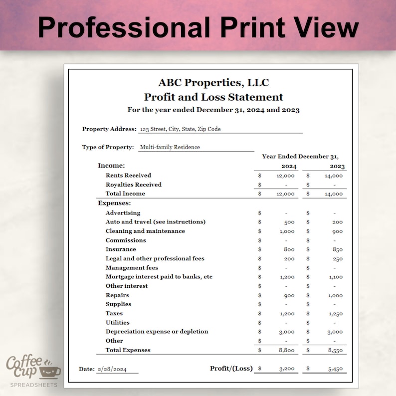 Rental Property Profit and Loss Statement Google Sheet and Excel