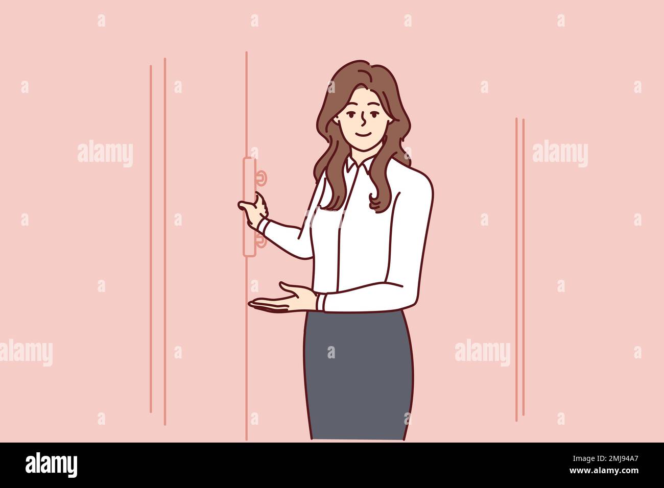 A Smiling Woman Secretary Opens The Door And Invites Visitors Inside