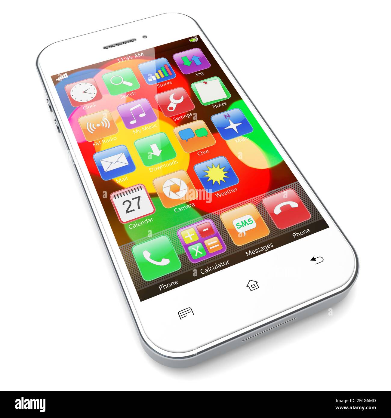 White mobile smartphone with colorful bokeh wallpaper and apps on a