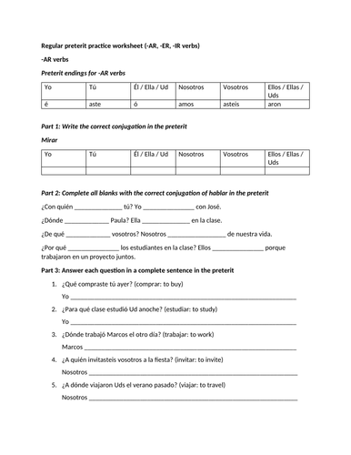 Regular preterit ar er ir verbs practice worksheet Teaching Resources