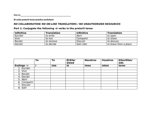 Regular er/ ir Preterite Verbs Conjugation Practice Worksheet TPT