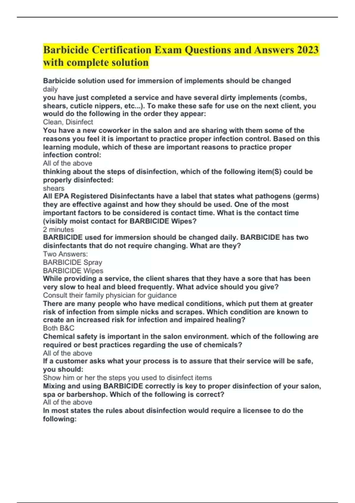 Barbicide Certification Exam Questions and Answers 2023 with complete