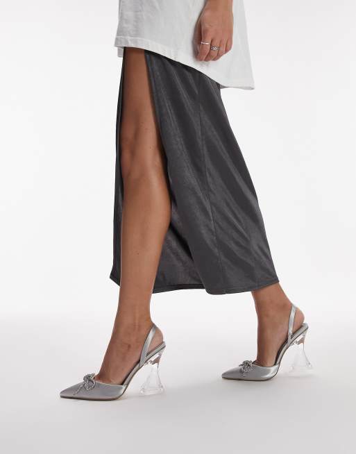 Topshop Rain sling back heeled court with bow in silver ASOS