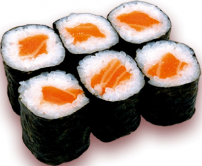 Japanese dish of cold cakes of rice with a topping of raw fish