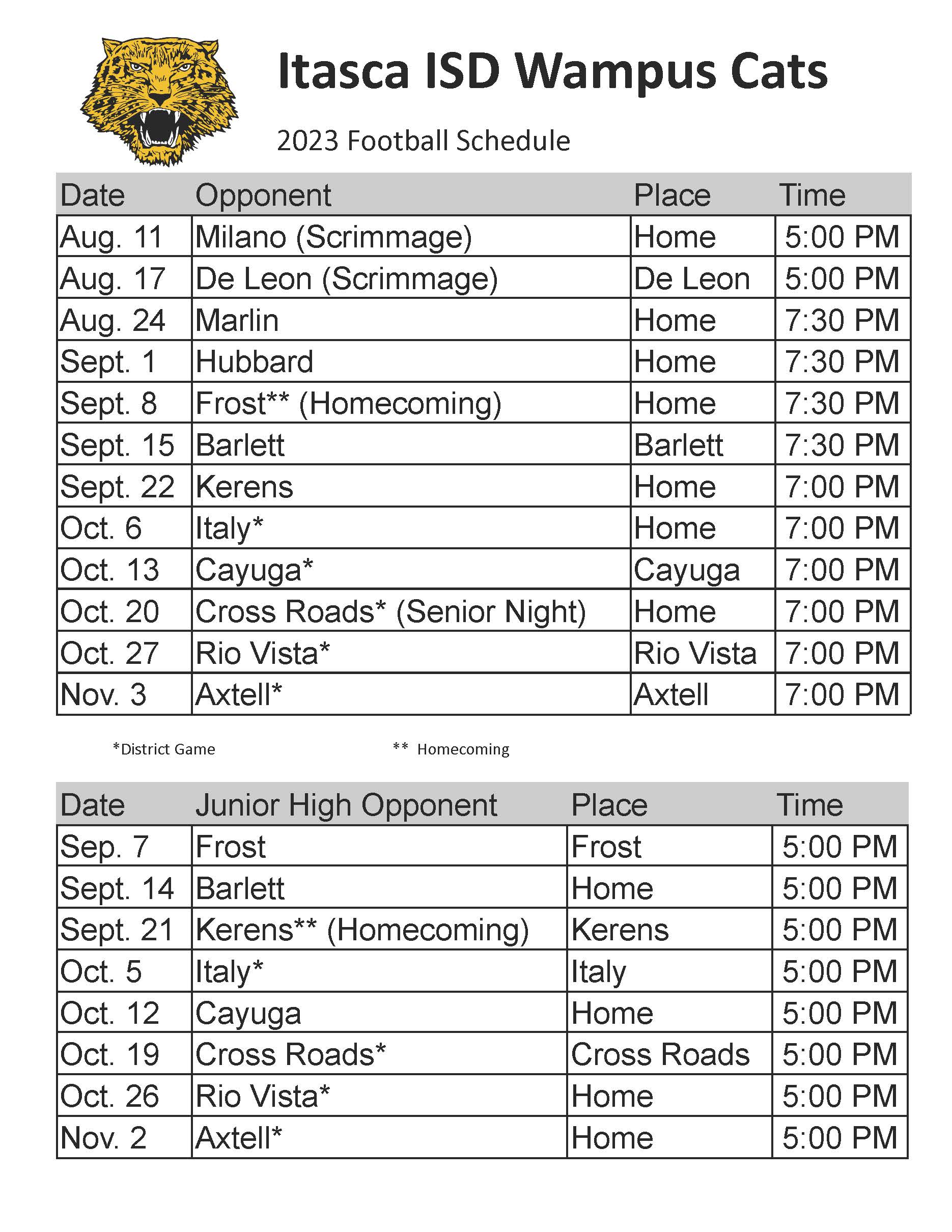 Athletic Schedules Itasca ISD