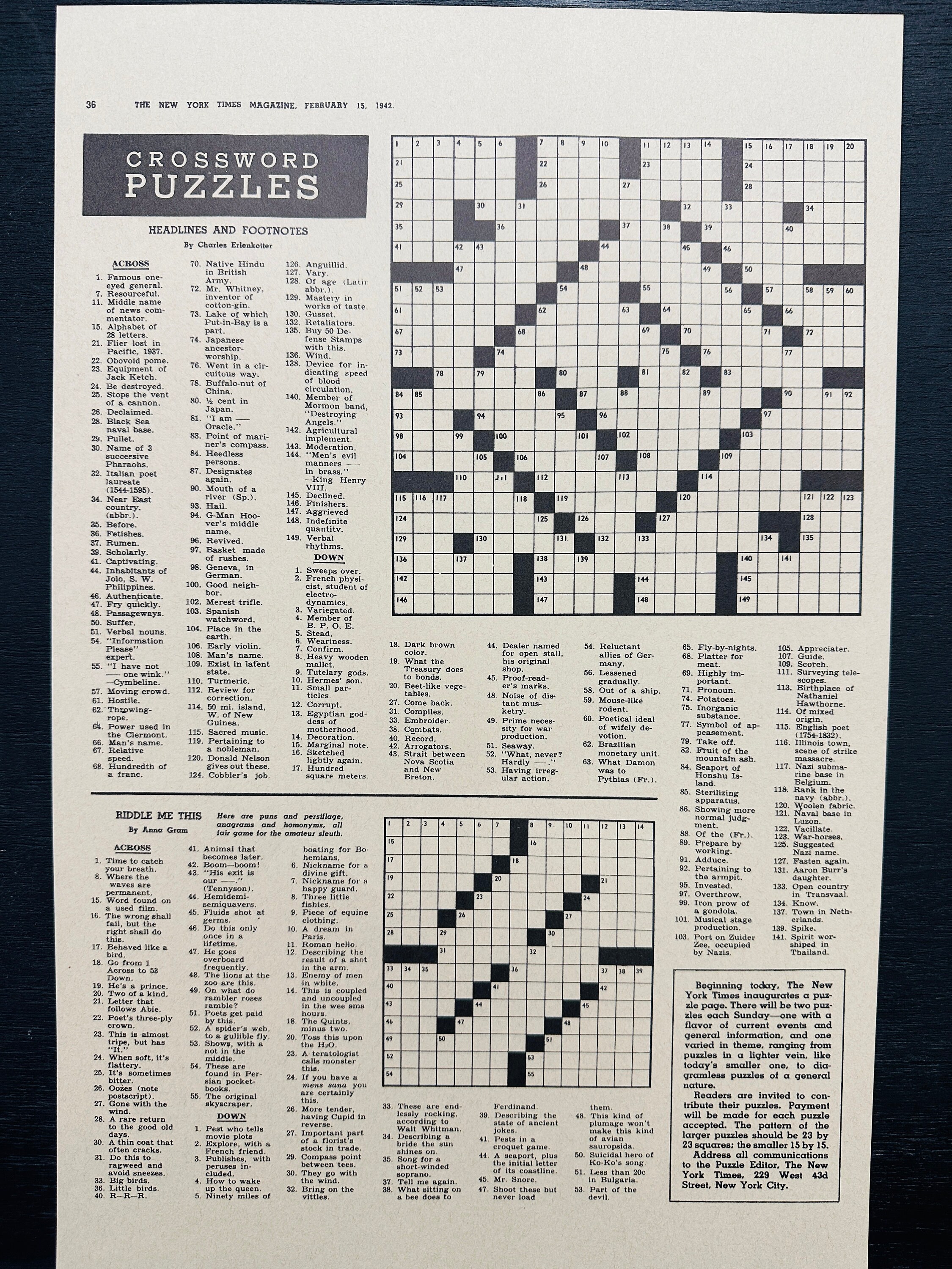 Reprint of the 1st NYT Crossword Puzzle Etsy