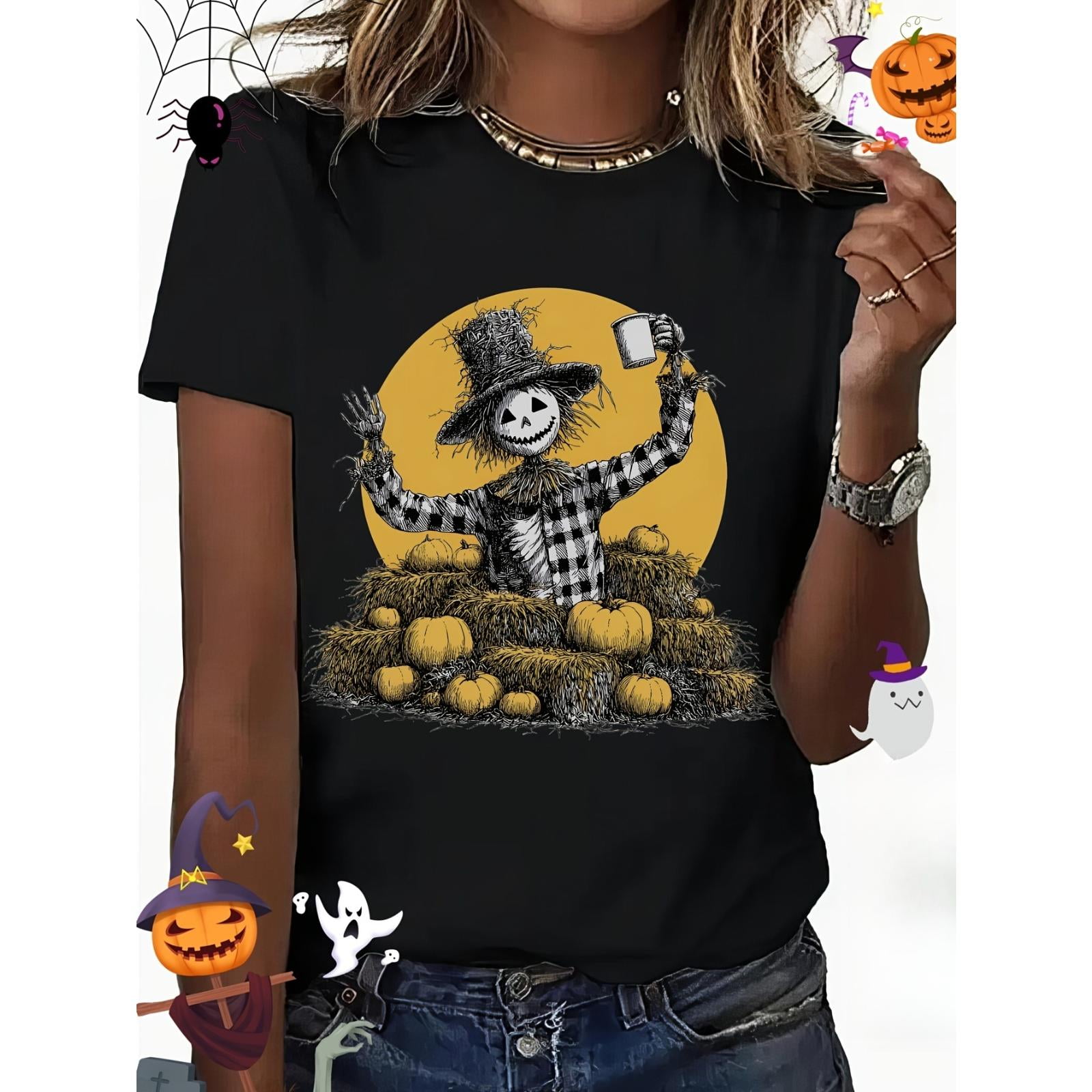 Retro 70s Vintage Halloween Tee with Scarecrow Bats Witches Jack O