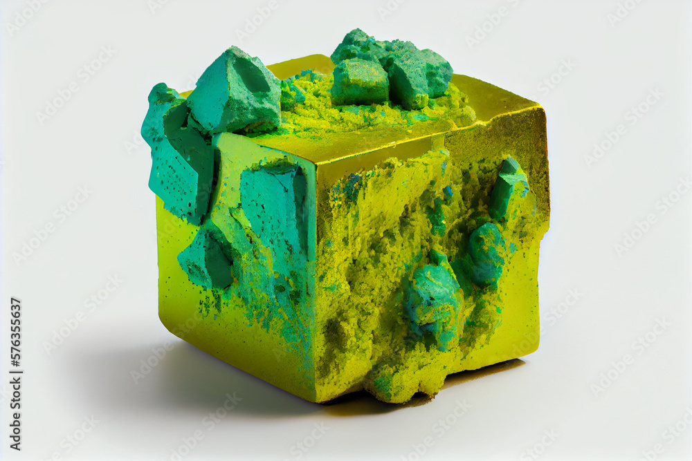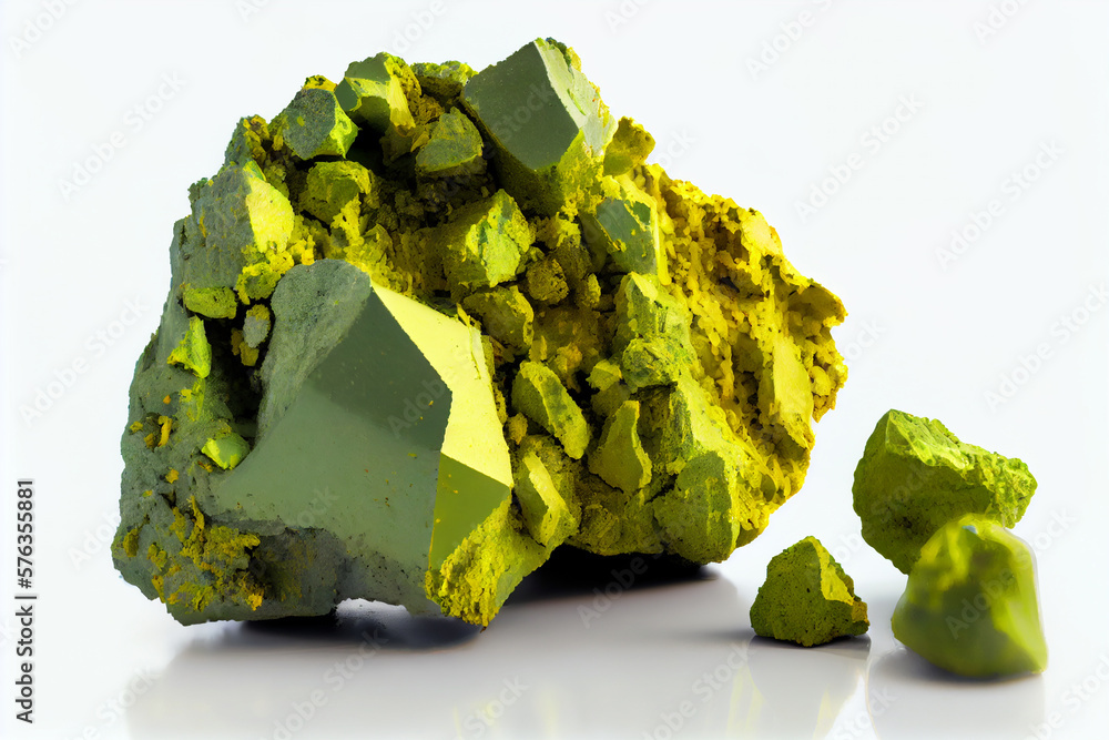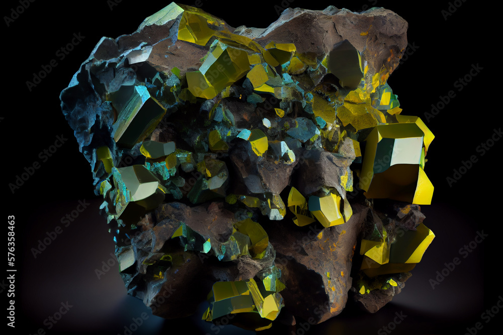 Jagged rock face with yellowgreen crystal formations of dark uranium