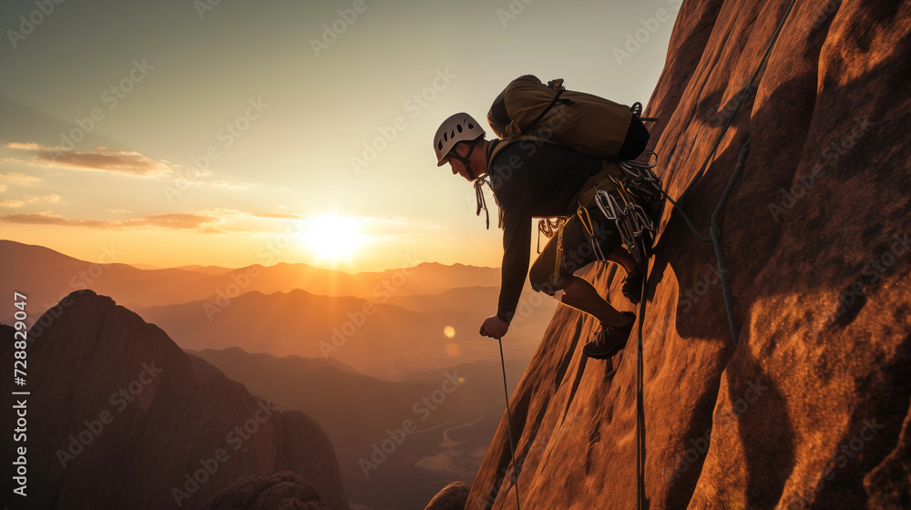 Rappelling Thrill seeker Descending Rugged Rock Formation Securely with