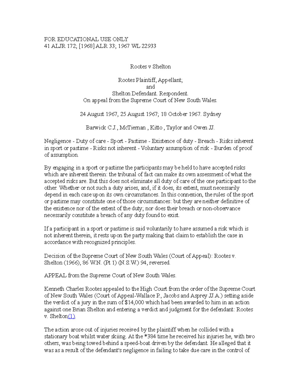 Rootes v Shelton Case study FOR EDUCATIONAL USE ONLY 41 ALJR 172