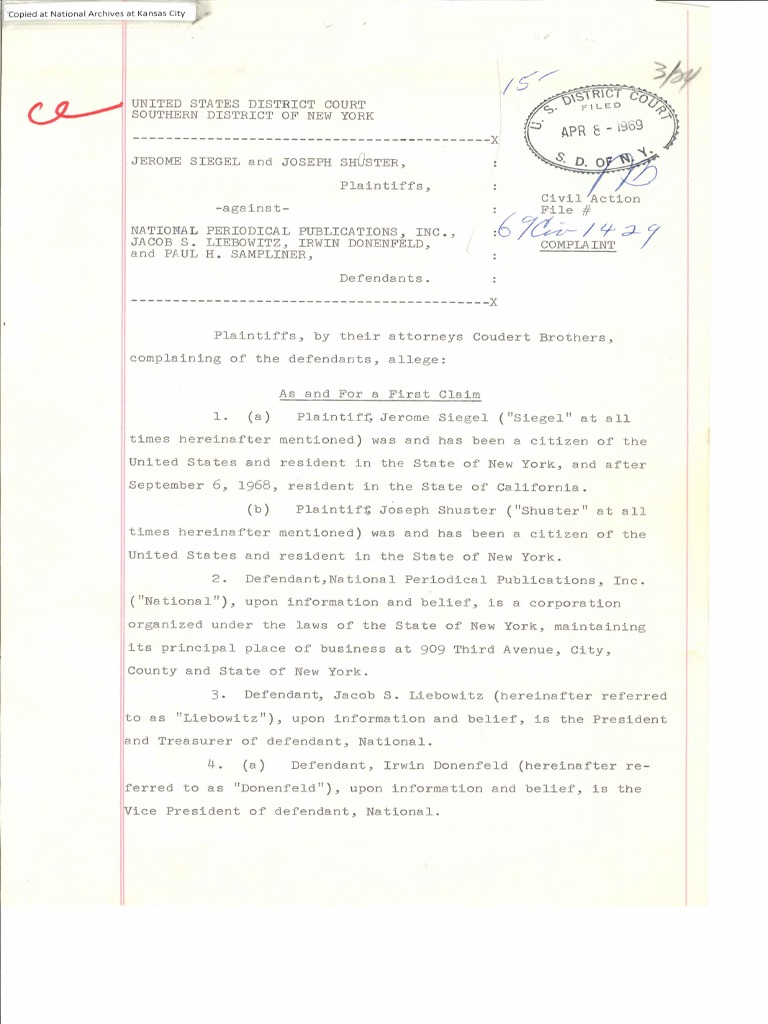 Plaintiffs Complaint From Jerome Siegel and Joe Shuster v National