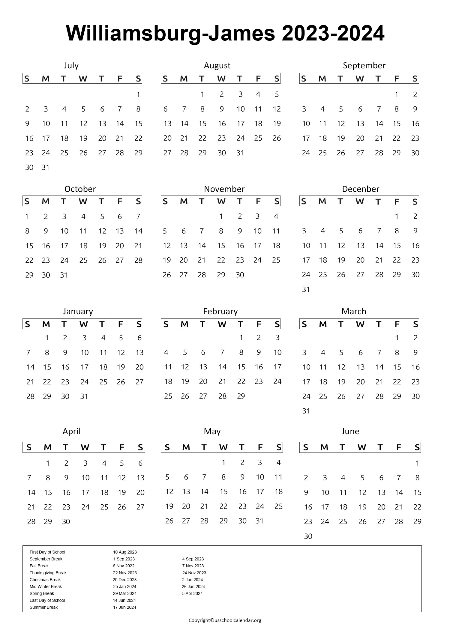 Williamsburg James City County Schools Calendar prntbl