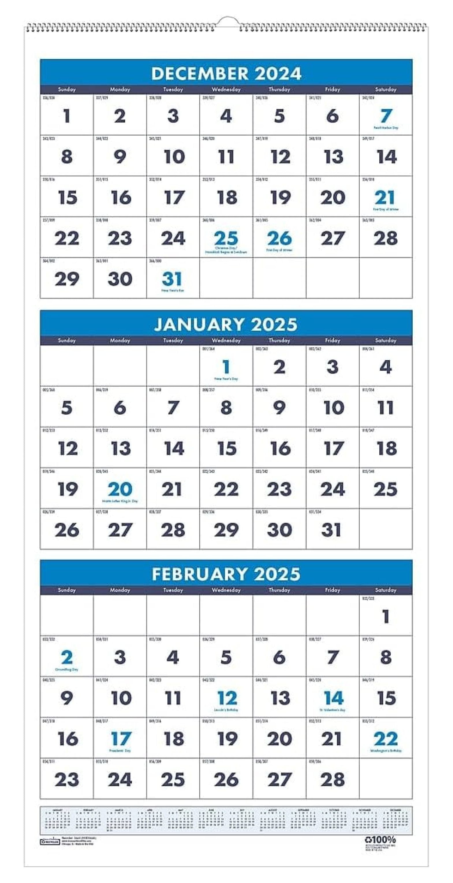 2025 Wall Calendar Three Month Vertical 12 25 x 26 December 2024