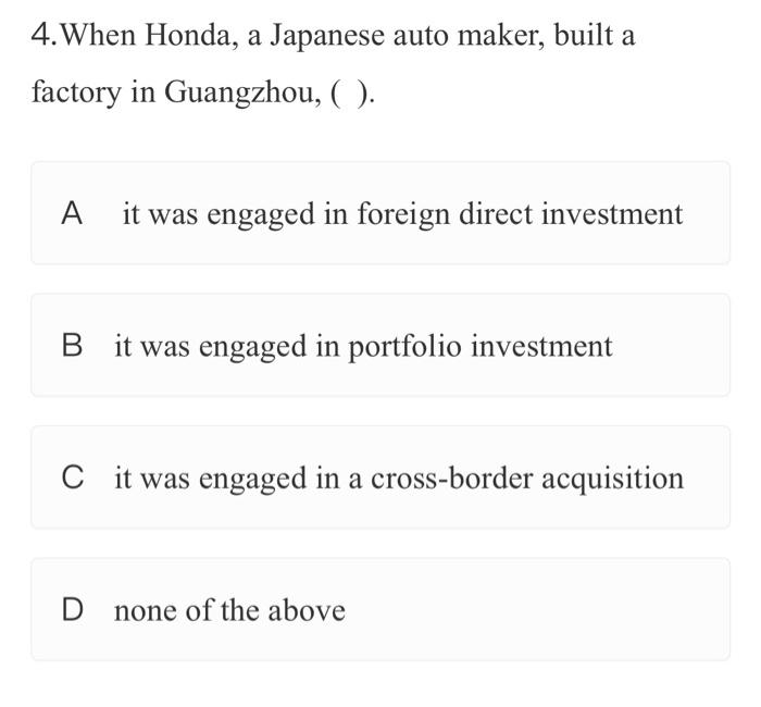 Solved 4 When Honda a Japanese auto maker built a factory Chegg com