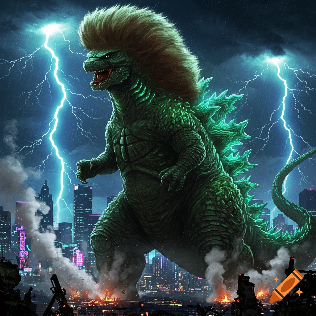 A giant Godzilla with glowing blue spines roars amidst a lightning