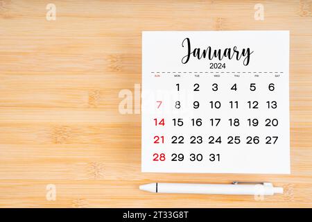 Jauary 2024 calendar page on wooden background with empty space Stock