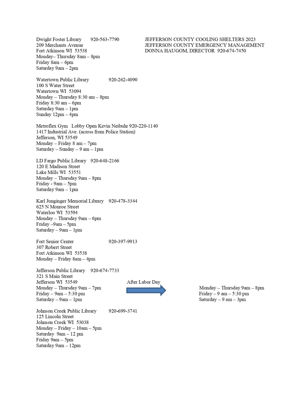 Cooling Shelters 2023 Town of Jefferson Jefferson County Wisconsin