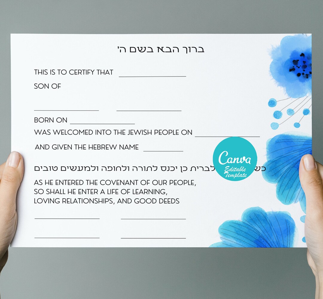 Personalized Jewish Baby Boy Naming Certificate Canva Template for