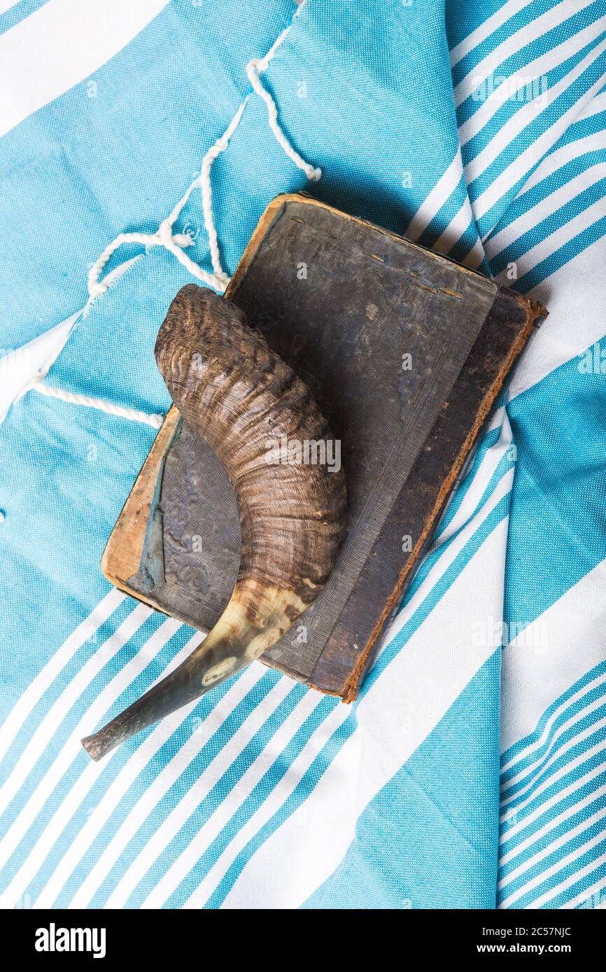 Jewish traditional objects Tallit Prayer book shofar horn on blue