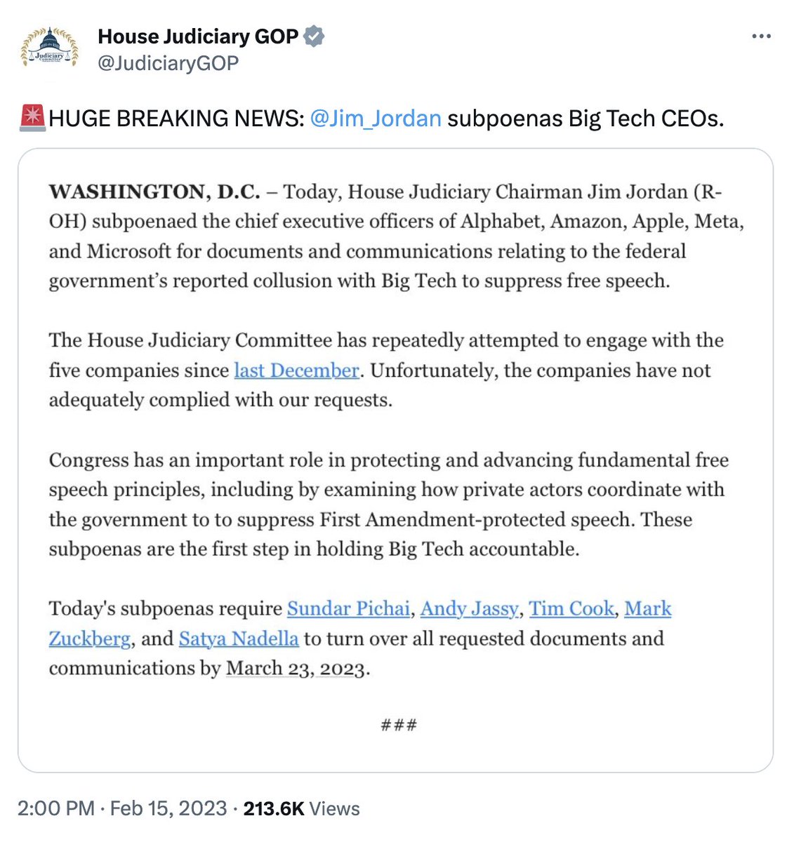 Weaponization Committee on Twitter: quot #NEW: Jim Jordan subpoenas Nina