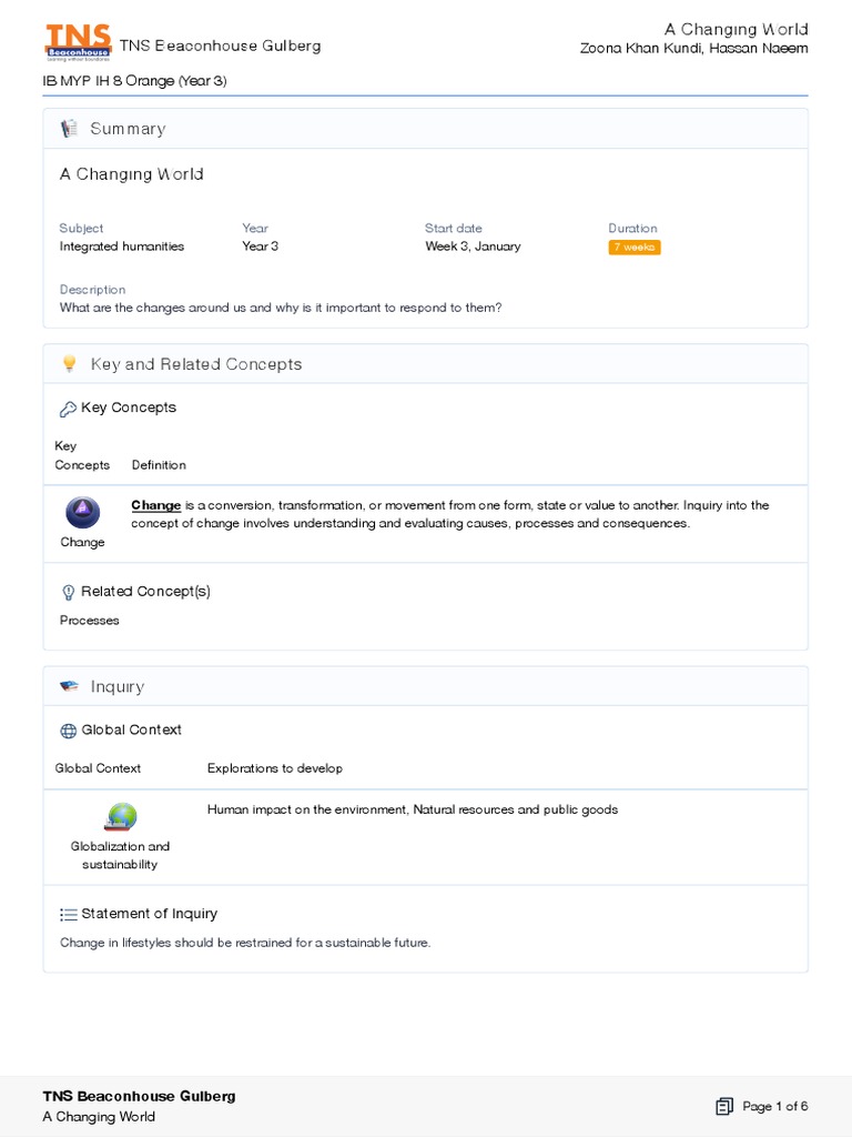 TNS Beaconhouse Gulberg: IB MYP IH 8 Orange (Year 3) Zoona Khan Kundi