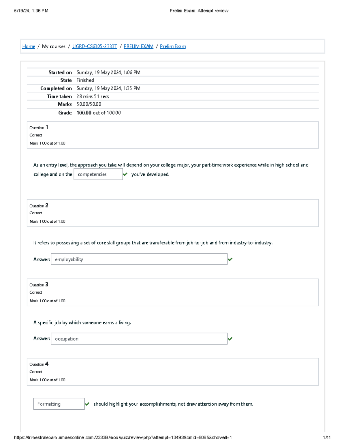 Prelim Exam Attempt review Home / My courses / UGRD CS6305 2333T