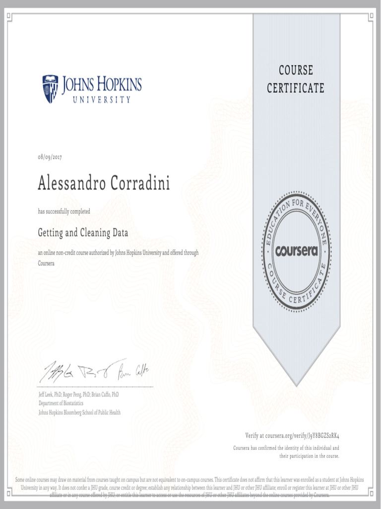 Coursera Getting and Cleaning Data Certificate John Hopkins