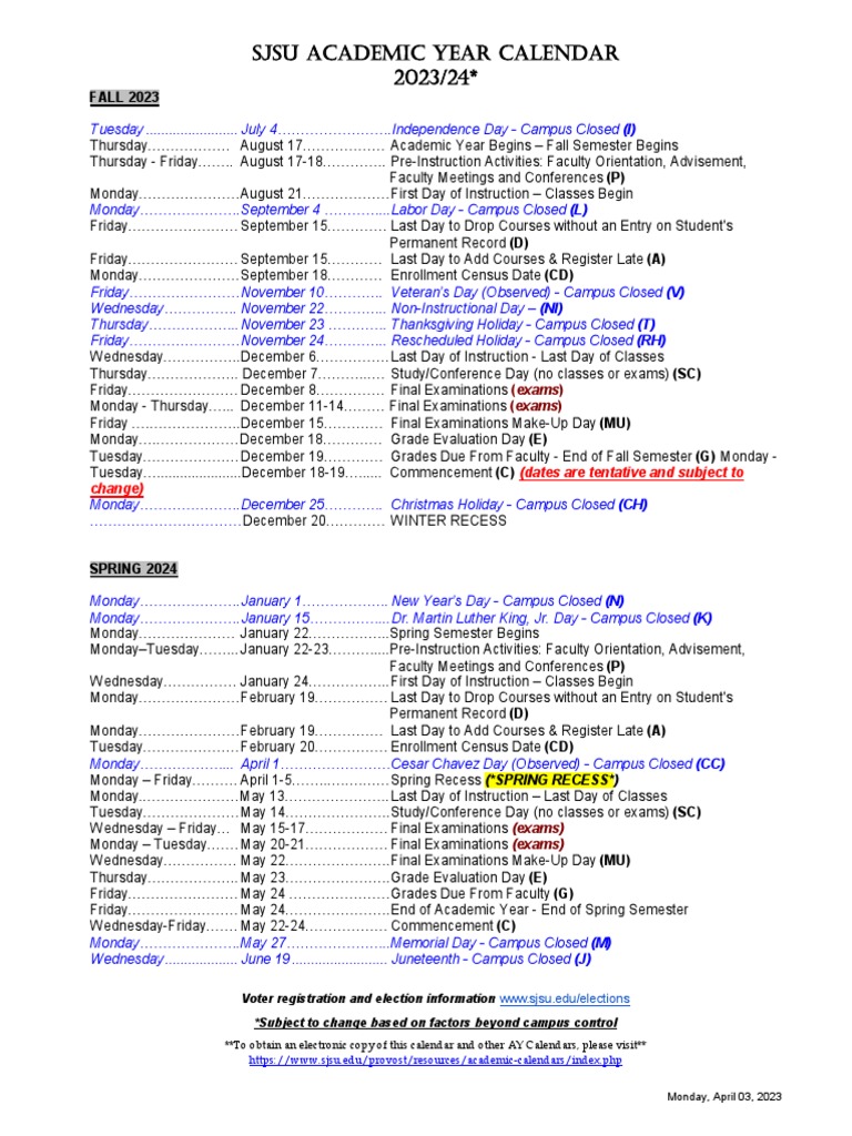 2023/24 SJSU Academic Year Calendar: Important Dates Holidays