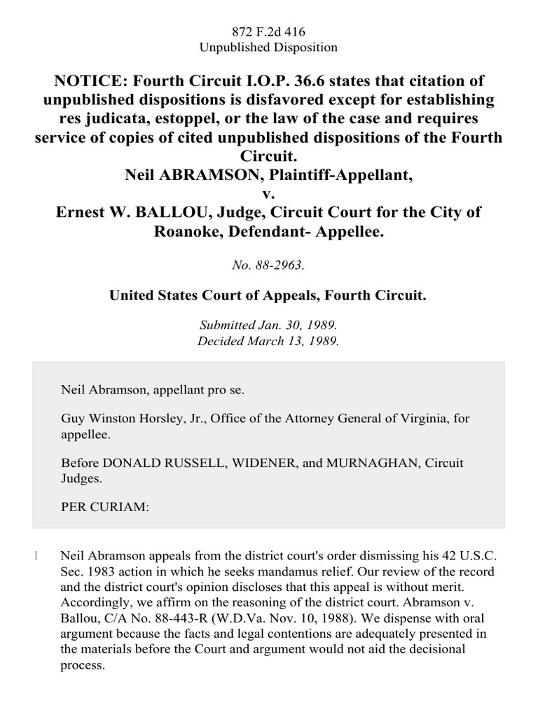 Neil Abramson v Ernest W Ballou Judge Circuit Court For The City of