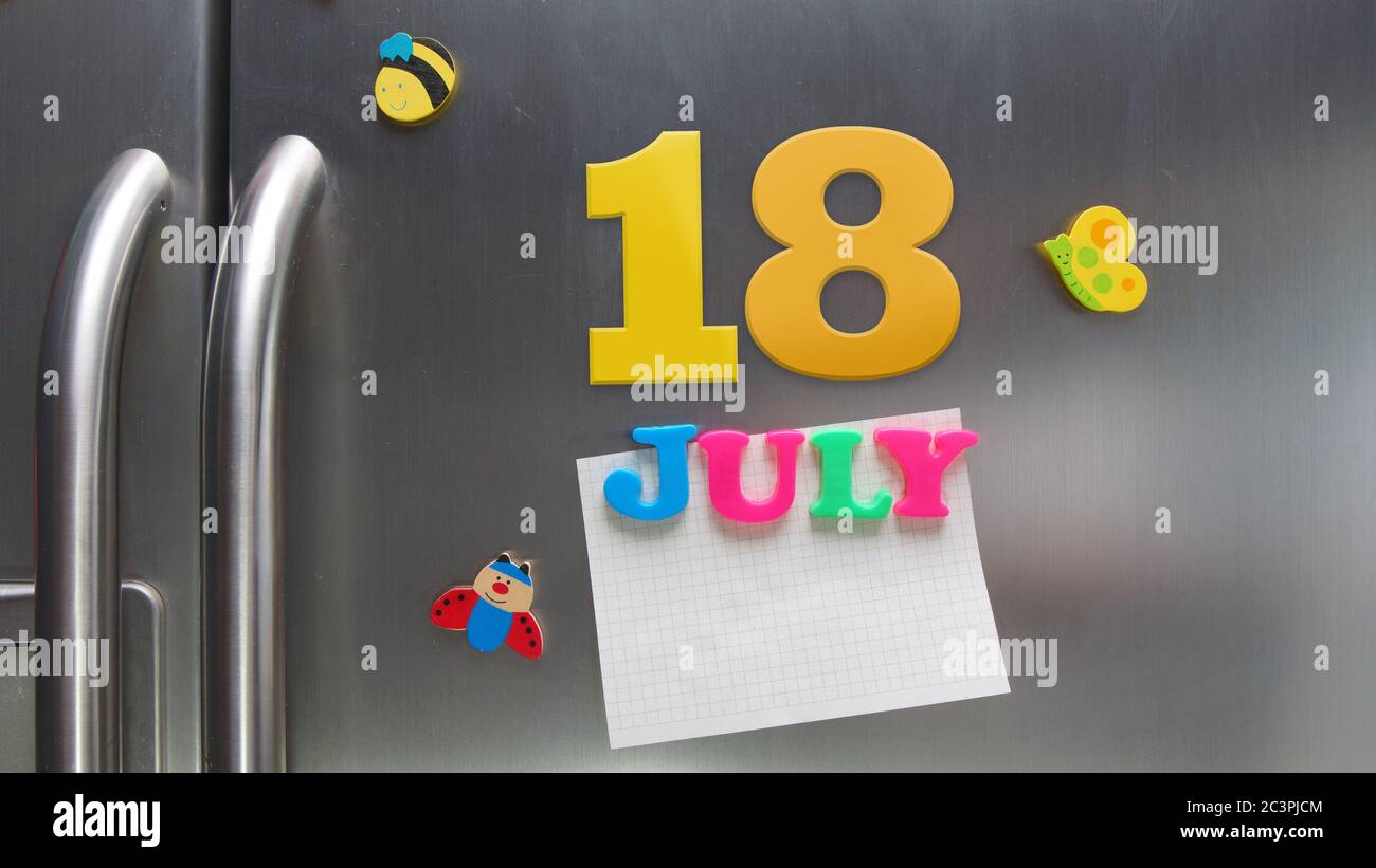 July 18 calendar date made with plastic magnetic letters holding a note
