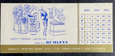 South Africa Risque July 1954 Calendar Ink Blotter Bumleys Printing