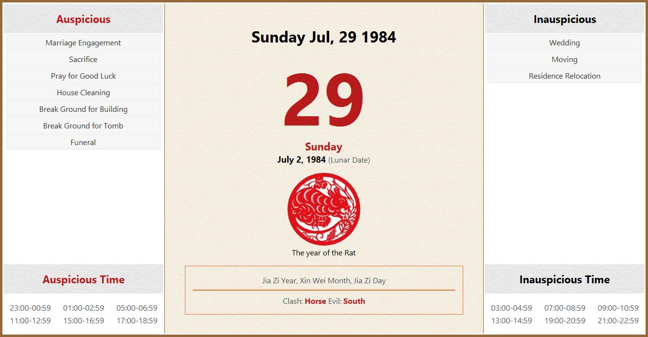 July 29 1984 Almanac Calendar: Auspicious/Inauspicious Events and Time