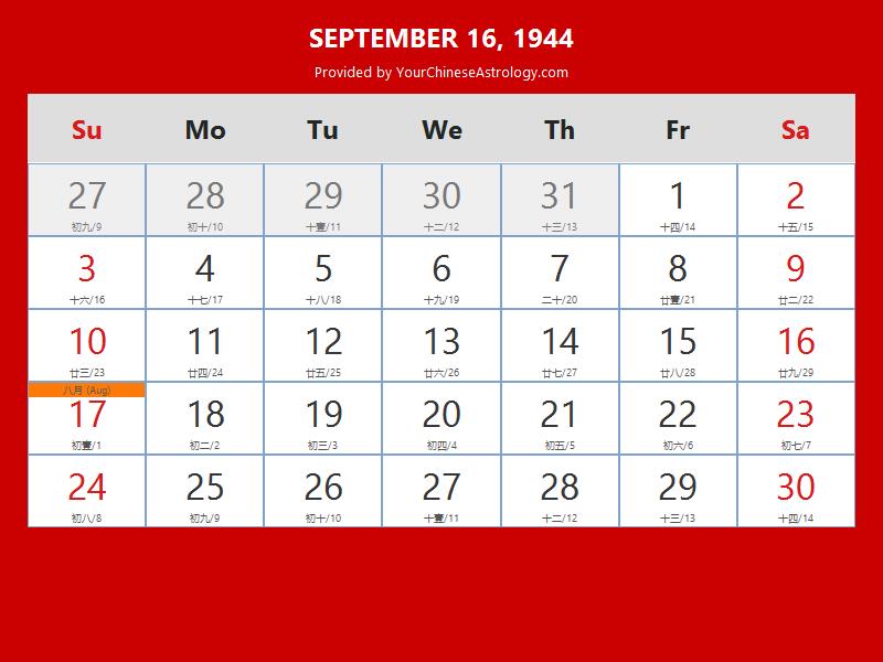 Chinese Calendar Sep 16 1944: Auspicious Things to Do and Hours Bazi