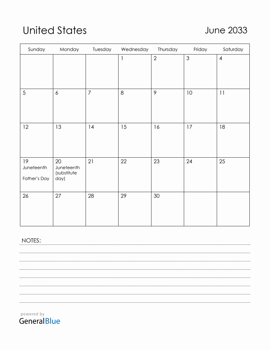 June 2033 Printable Monthly Calendar with Notes Monday Start