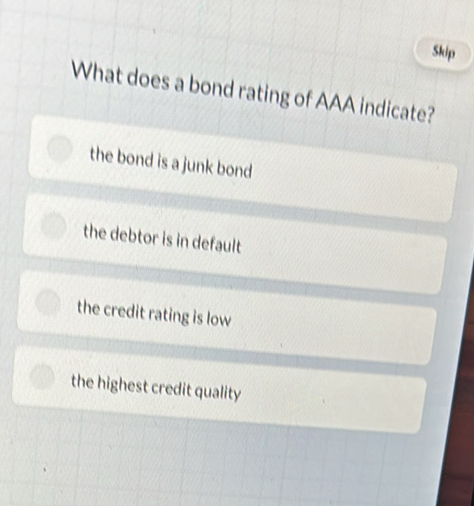 Solved: Skip What does a bond rating of AAA indicate? the bond is a