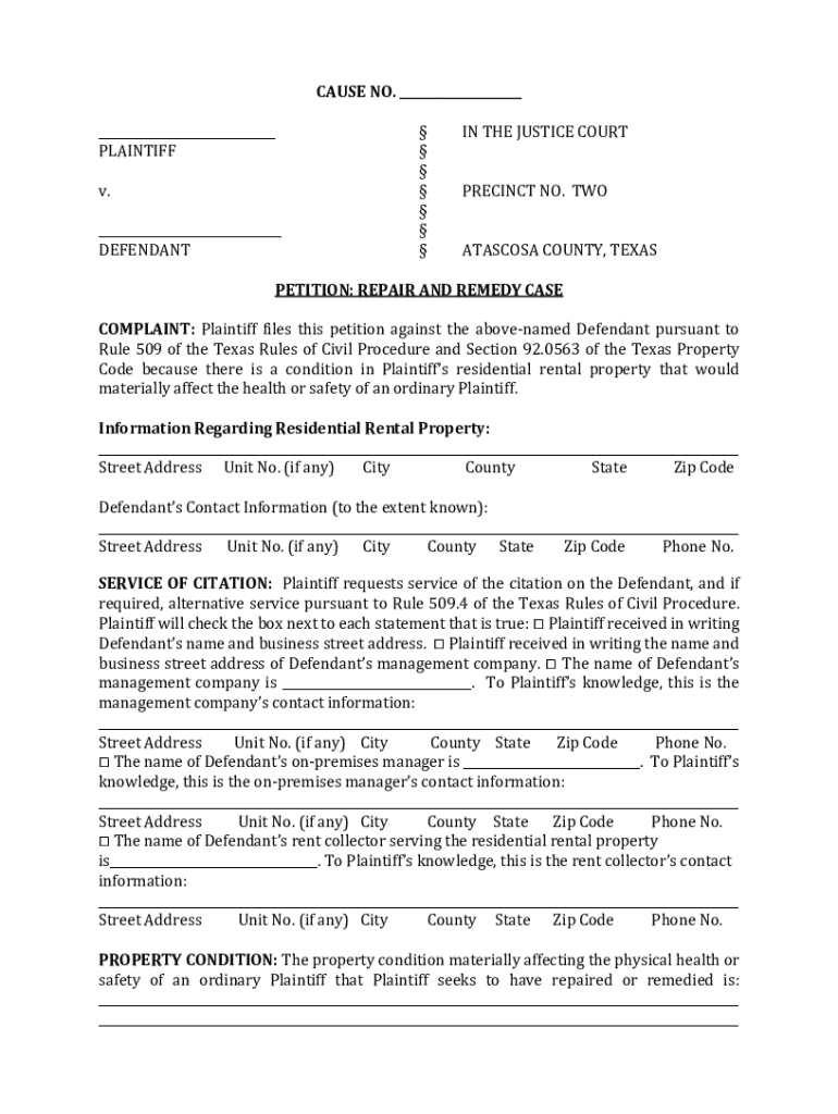 Fillable Online CAUSE NO TENANT In the Justice Court Precinct 3 Place