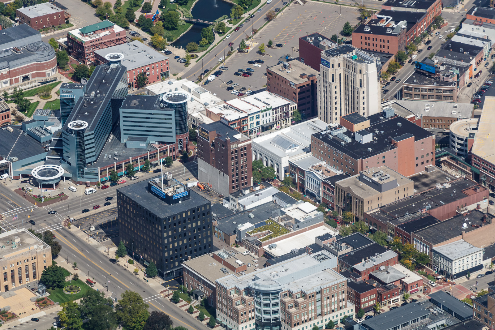 Aerial Downtown Kalamazoo Skyline with Modern and Historic Buildings