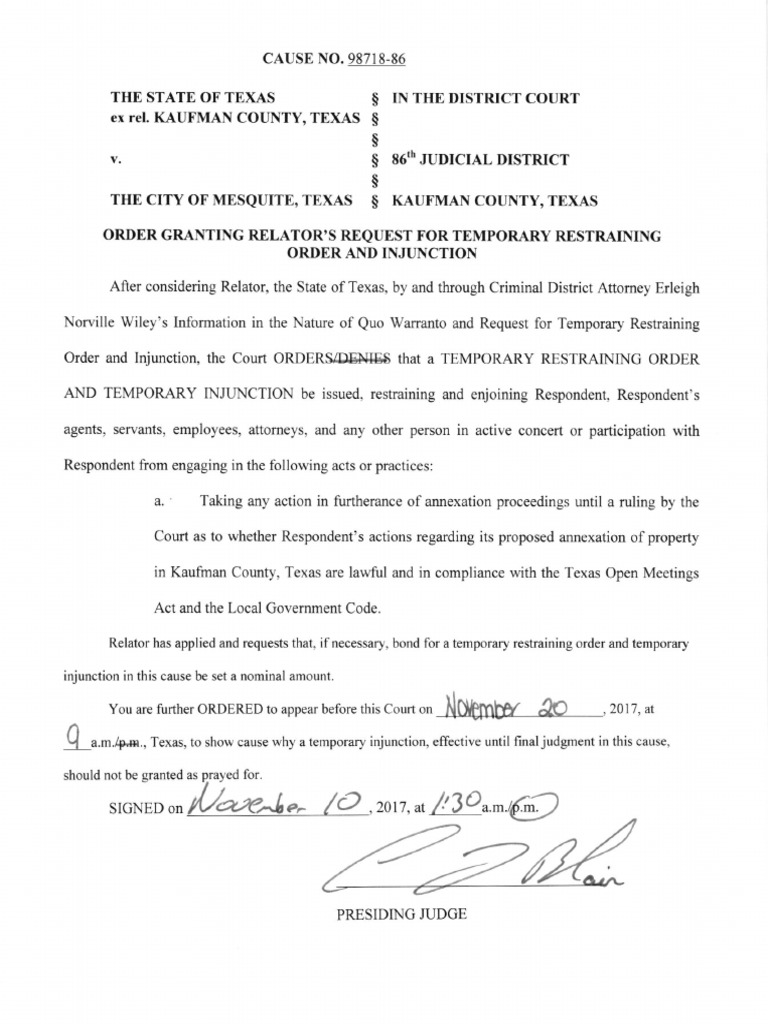 Kaufman Co Judge Casey Blair Orders Temporary Restraining Order and