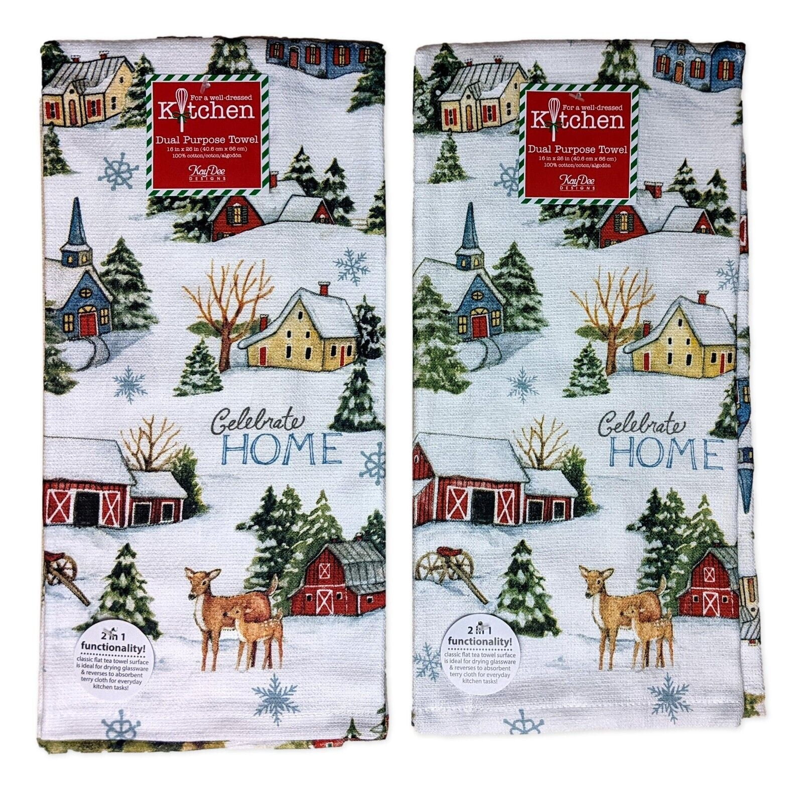 Set of 2 HOME FOR CHRISTMAS Village Terry Kitchen Towels by Kay Dee