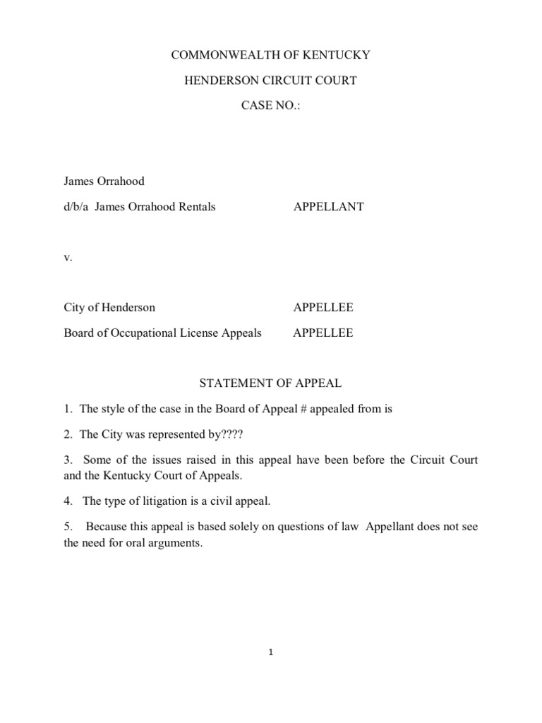 Kentucky Court of Appeals Civil Appeal Hearing Statement courts ky