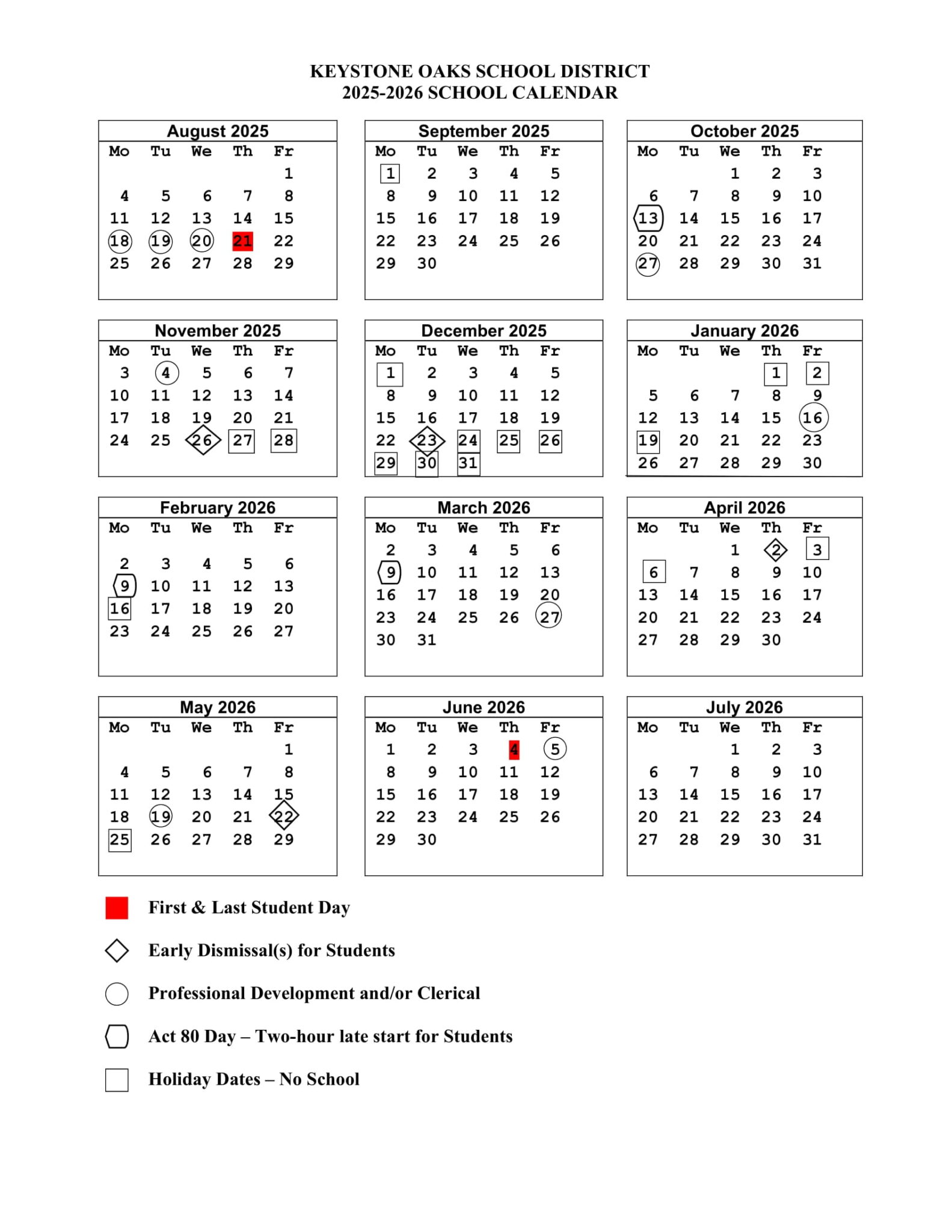 Keystone Oaks School District Calendar 25 26 PDF Revised EduCounty