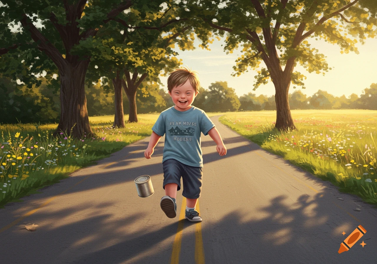 A smiling boy with Down syndrome kicks a can down a sunny tree lined