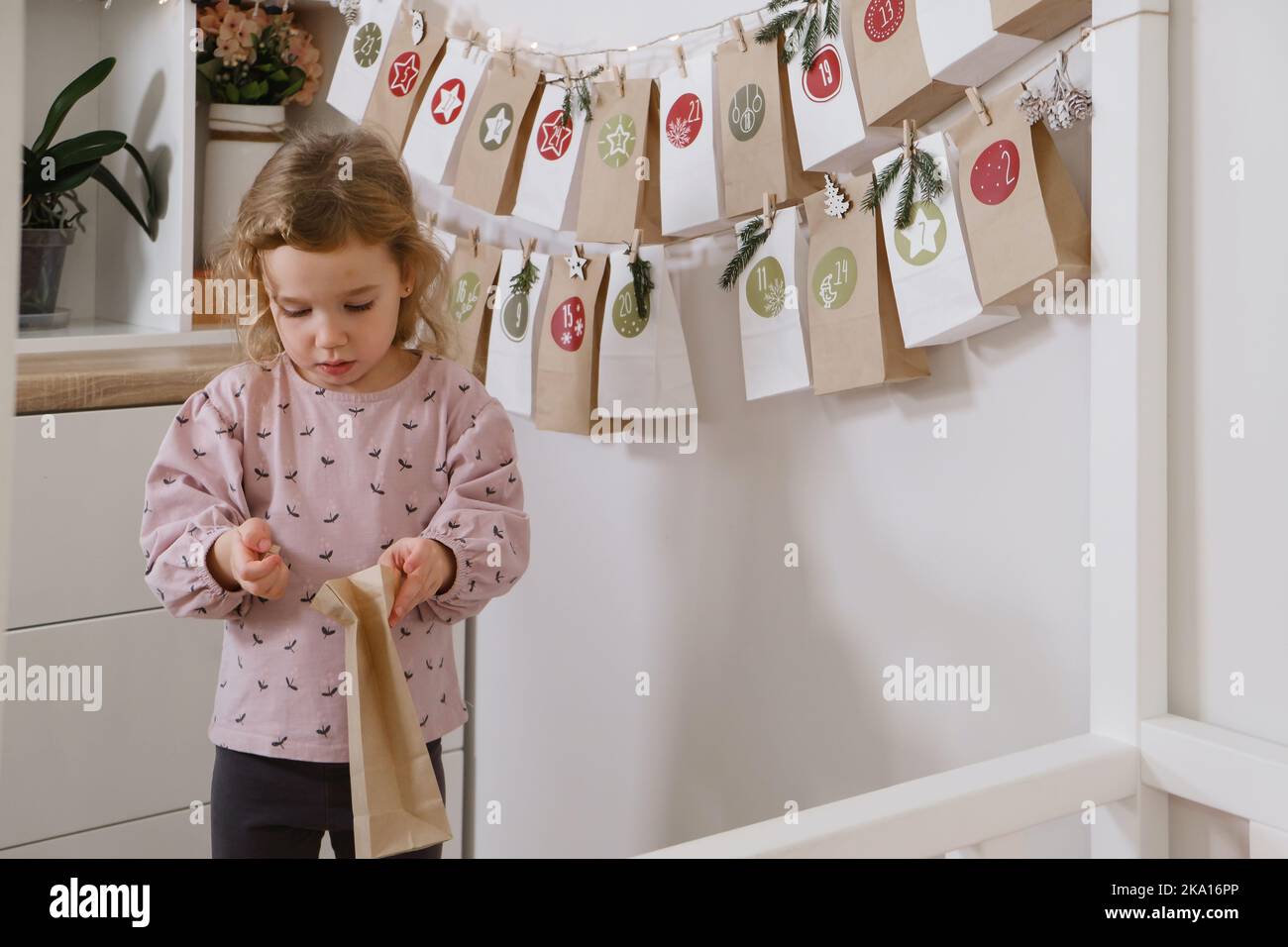 Toddler child gets new advent calendar task waiting for Christmas