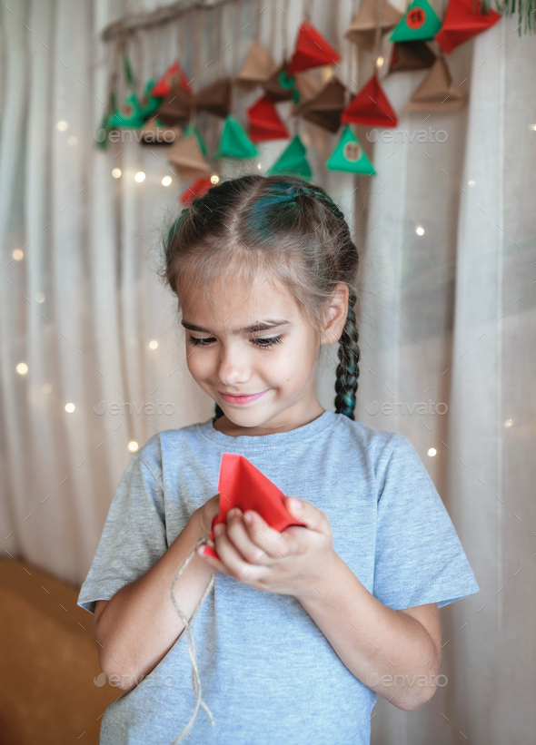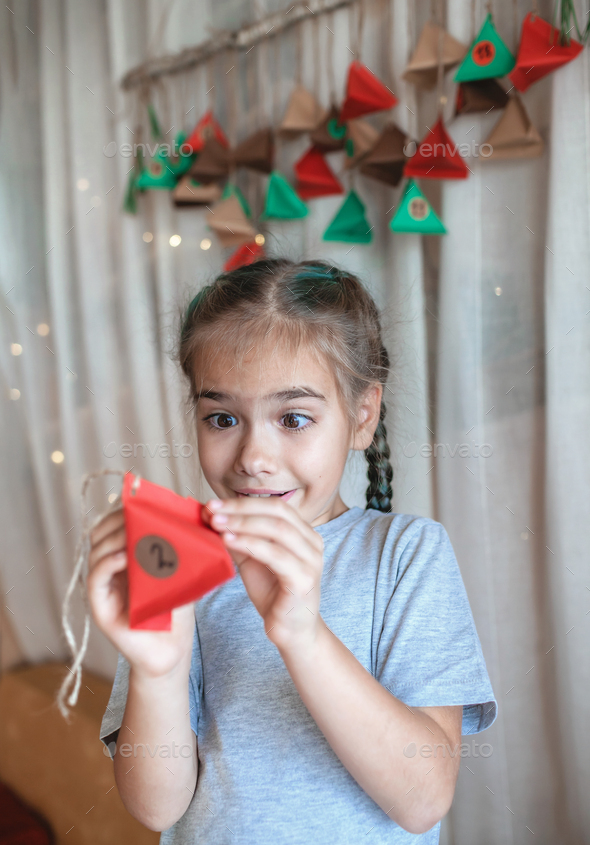 Kid opening handmade advent calendar with color paper triangles