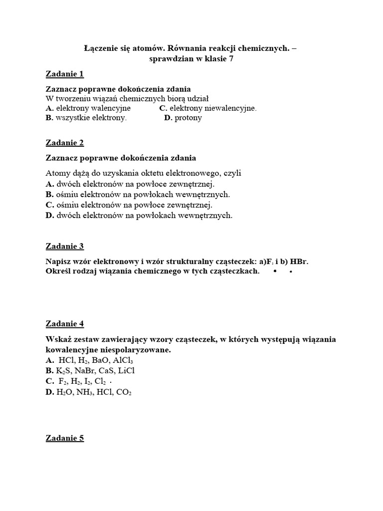 Łączenie Się Atomów Równania Reakcji Chemicznych Sprawdzian W Klasie