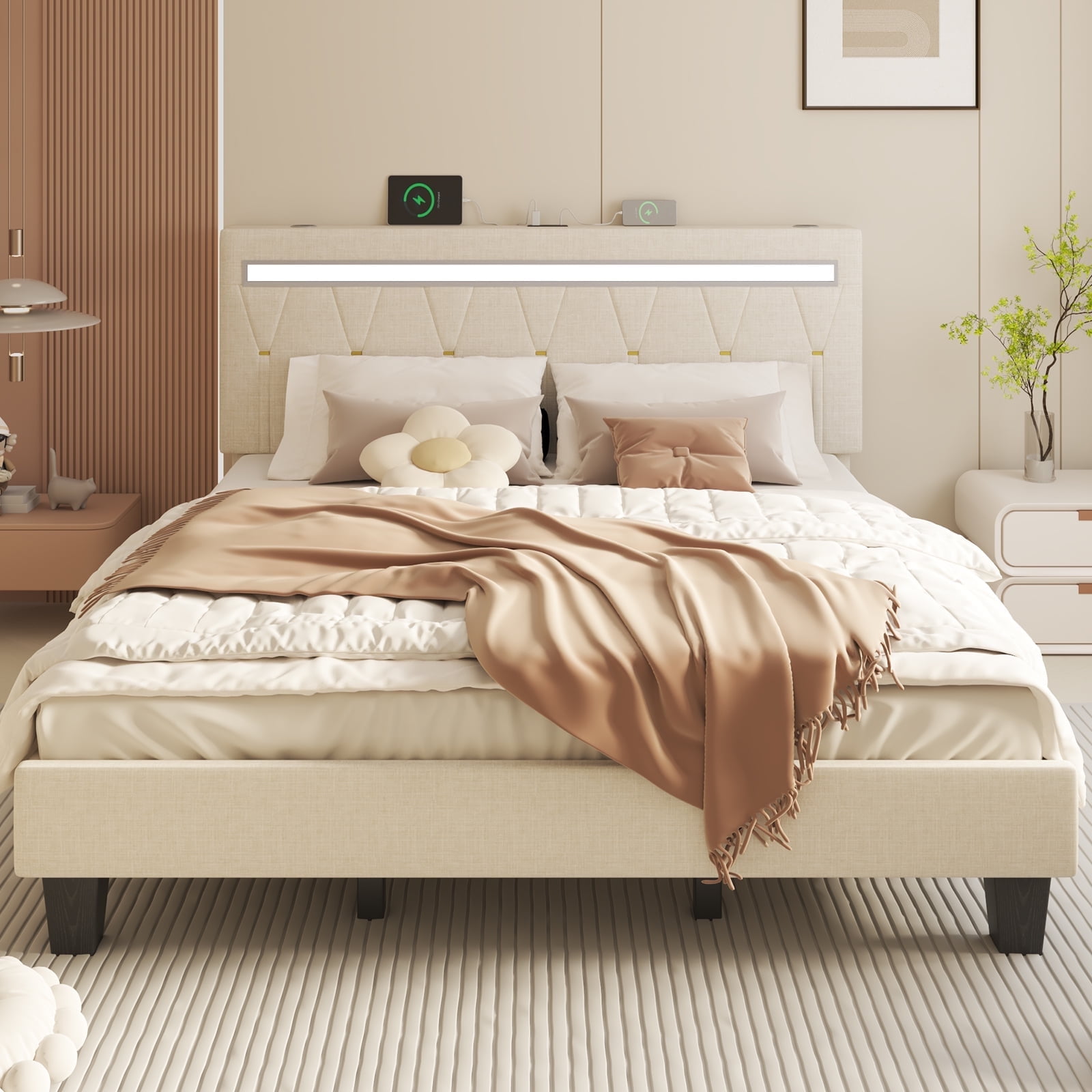 E motie Upholstered King Bed Frame with Adjustable Headboard and LED